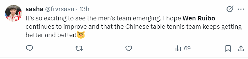 球迷:看到国乒男队有人崭露头角太令人兴奋了,我希望温瑞博能继续进步,也希望国乒越来越出色。